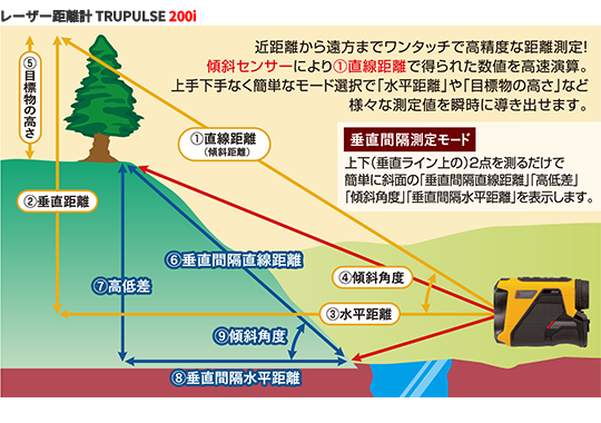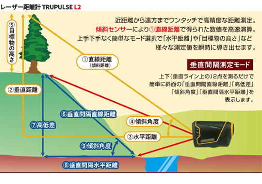 ①直線距離(傾斜距離) ②垂直距離 ③水平距離 ④傾斜角度 ⑤目標物の高さ