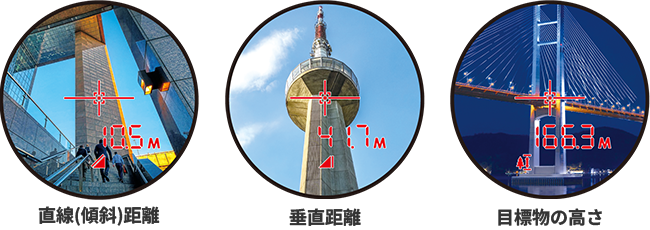| 測定モード | 直線距離(傾斜距離)、水平距離、垂直距離、傾斜角度、目標物の高さ、方位角 | 直線距離(傾斜距離)、水平距離、垂直距離、傾斜角度、目標物の高さ | 直線距離(傾斜距離)、水平距離、垂直距離、傾斜角度、目標物の高さ |